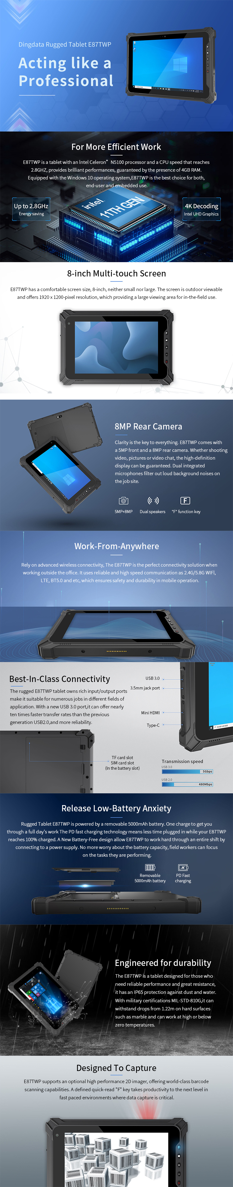 E87TWP support for Windows 10/11 system,Intel Jasper Lake processor Celeron N5100 CPU, it built-in 10000mAh battery, 10 hours of machine endurance. It up to IP65 Waterproof and Dustproof Level, MIL-STD-810G certified. At the same time, support GPS, Glonass, more accurate positioning and 1D/2D, NFC and other functional modules for free selection. Support aviation plug to meet the requirements of industrial electricity. Integrated 3G/4G all network communication, WiFi, Bluetooth and other communication modes.