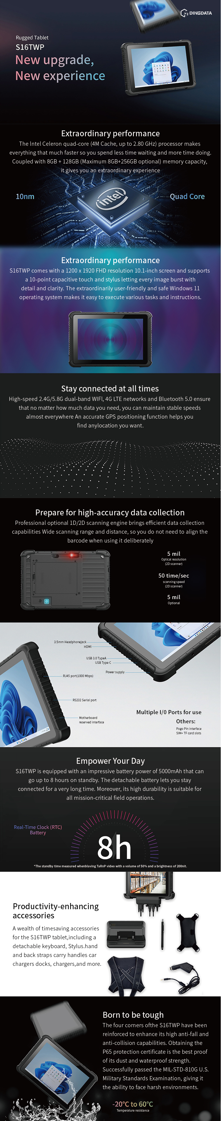 S16TWP support for Windows 11 Pro system, it built-in 5000mAh/7.6V pluggable battery, 10 hours of machine endurance. It up to IP65 high protection level, in accordance with MIL-STD-810G. At the same time, support GPS, Glonass, more accurate positioning and 1D/2D, NFC, ID card and other functional modules for free selection. Support aviation plug to meet the requirements of industrial electricity. Integrated 3G/4G all network communication, WiFi, Bluetooth and other communication modes.